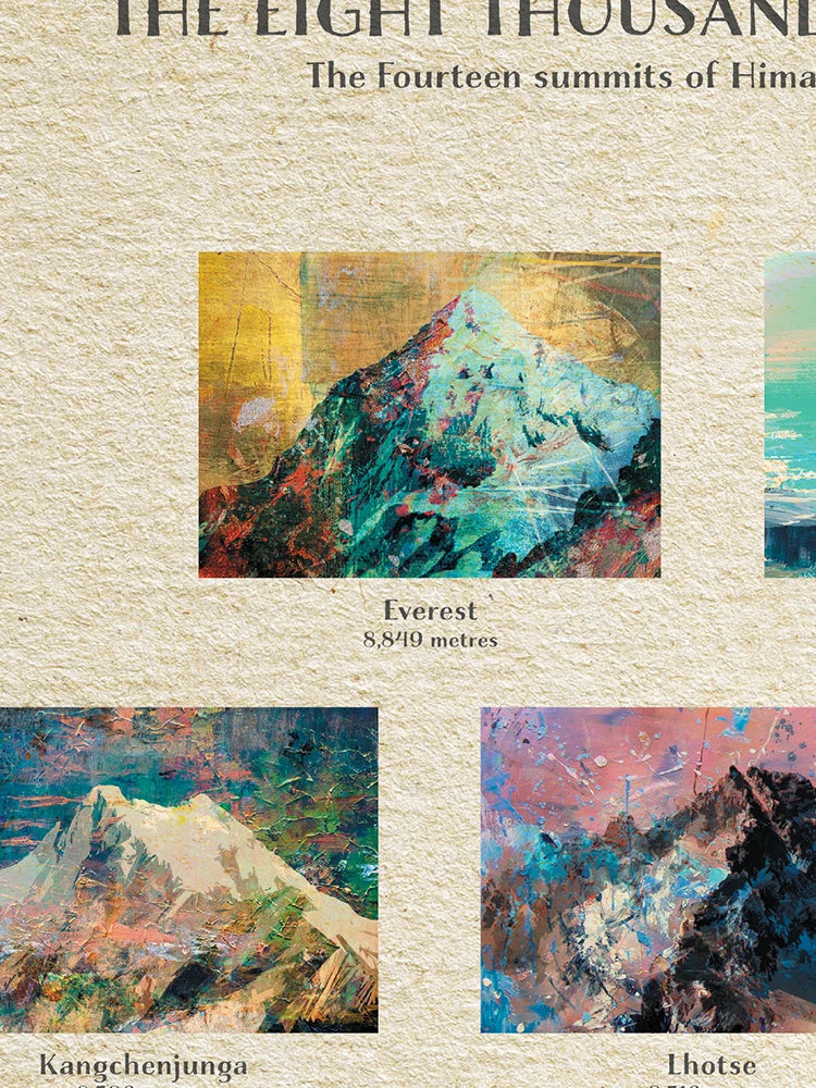 Our Eight Thousand Metres Poster Print celebrates the 14 mountains in the World over 8,000 metres. This beautiful design captures each of the famous peaks in an abstract style. Including Everest, Annapurna, Makalu, Lhotse, Manaslu. The World's fascination with these mountains and the history of the ascents never diminishes.