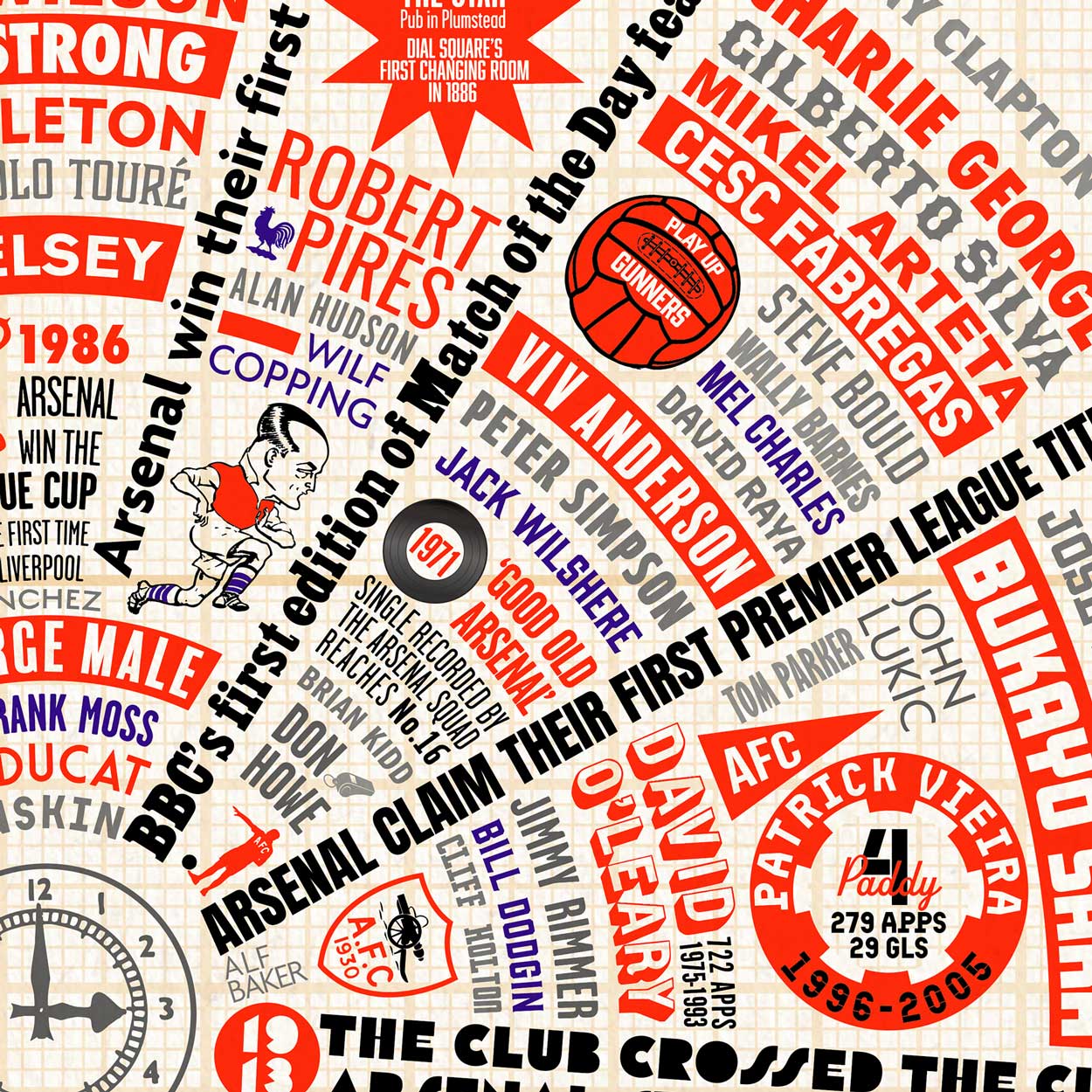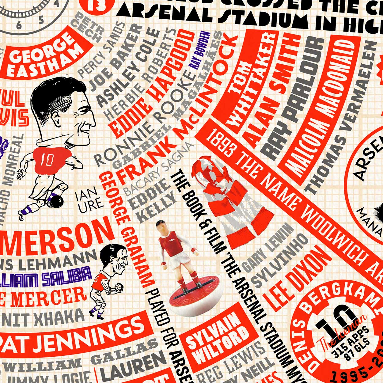 Our Arsenal Wheel of Fame Poster Print celebrates the events and names of this historic football club. From Dial Square to Arsenal, from Plumstead to Holloway!