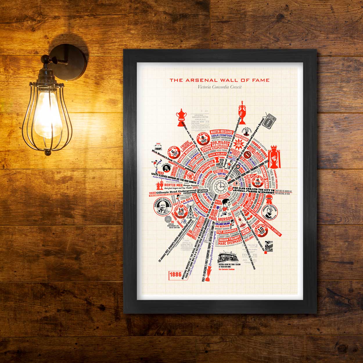 Our Arsenal Wheel of Fame poster print is available unframed, or framed in a 4cm black or white wooden frame with a plexiglass cover.