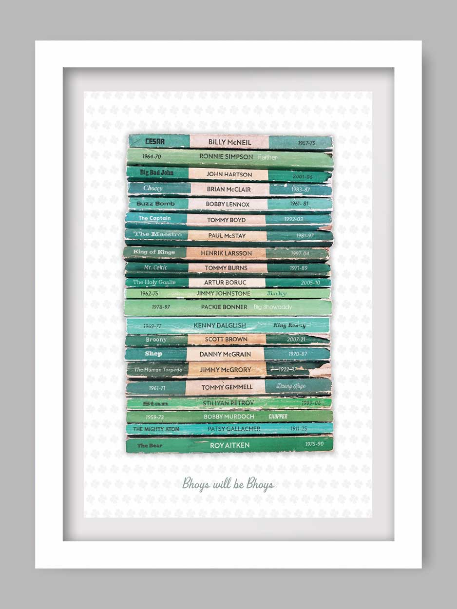 Bhoys will be Bhoys - Celtic poster print celebrates some of the great names in the club's history. It features the years they played for the club and their nicknames. Styled on the classic mid-century penguin book designs.