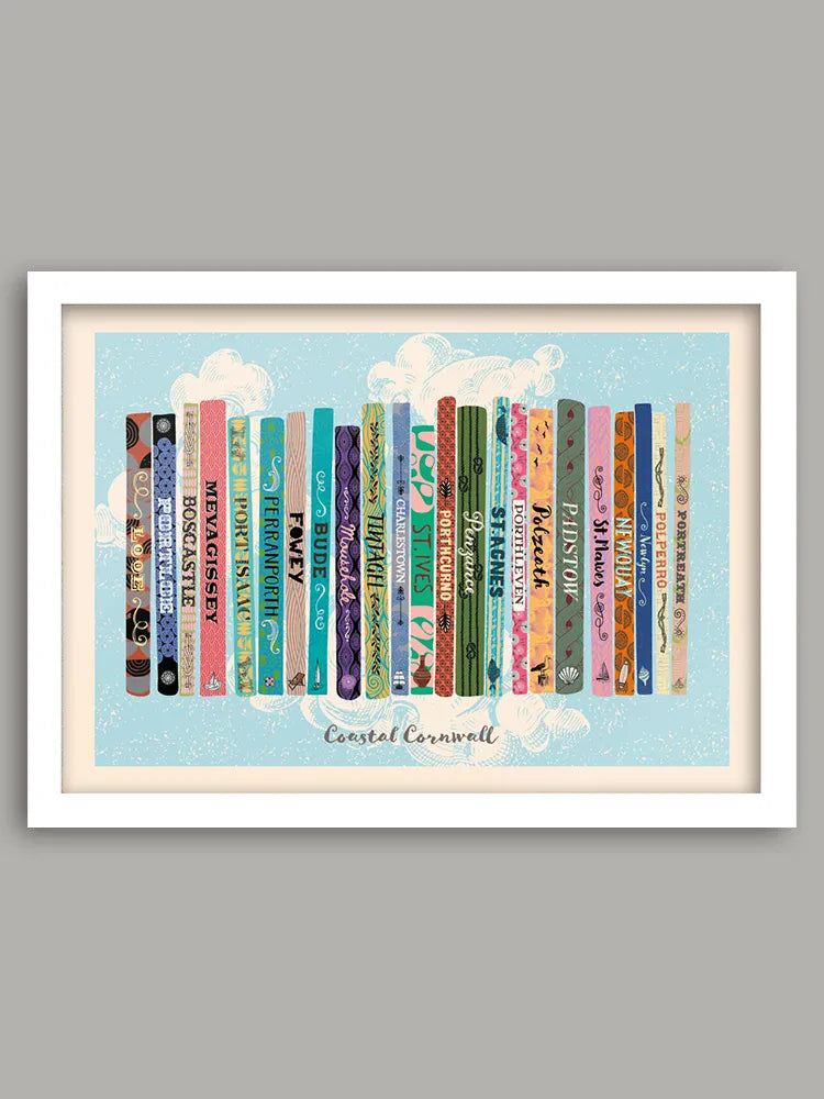 Celebrating some of Cornwall's famous beaches and coastal towns. The design features a bookshelf style with each place being the title of a book. The pretty patterns and soft colours make this a beautiful piece for your wall.