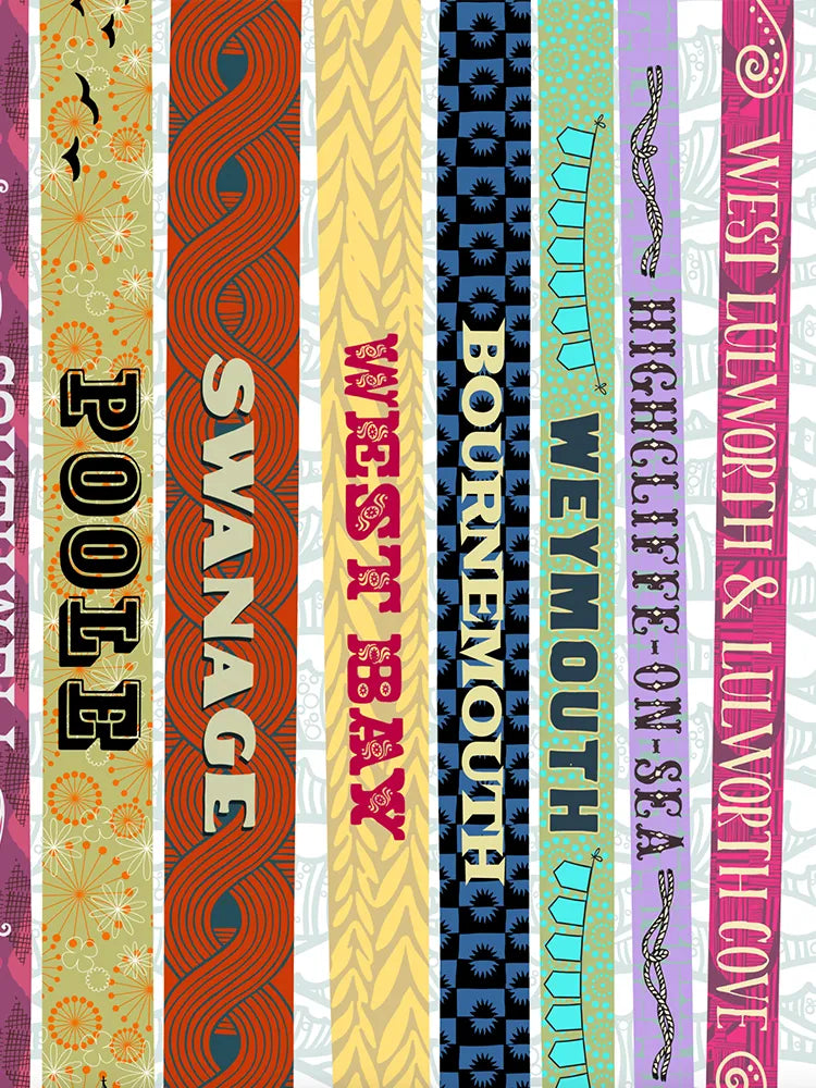 Coastal Dorset - Poster print. Featring some of Dorset's best loved beaches and coastal towns. Which is your favourite? The design is in the style of a bookshelf, with each title being a place in Dorset. The lovely patterns and colours make this a beautiful piece for your walls.