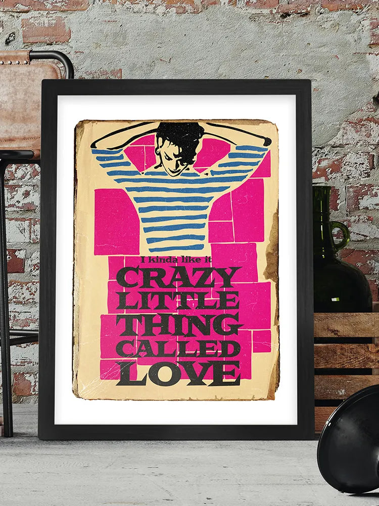 Crazy Little Thing Called Love music poster print is available unframed, or framed in a 4cm black or white wooden frame with a plexiglass cover.