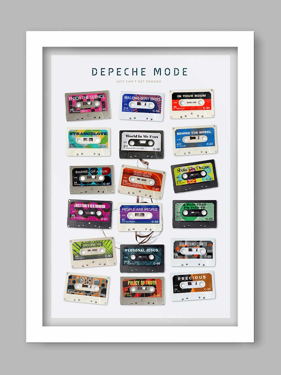 Our Depeche Mode - Cassette Music Poster Print celebrates 18 of the band's singles. Each cassette label has been individually designed incorporating the single, B Side, year of release and its UK Singles chart highest position.