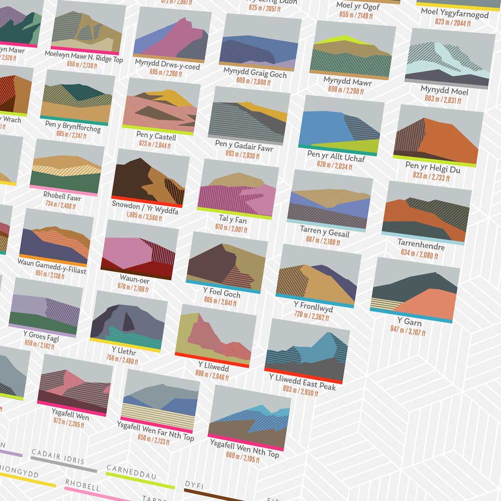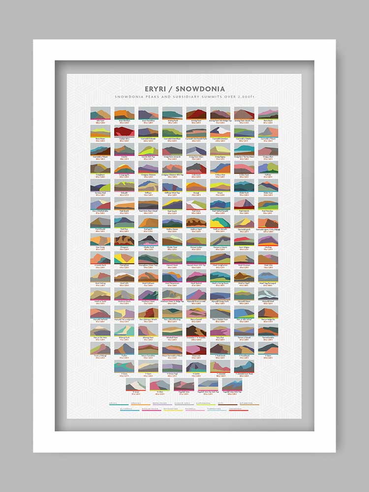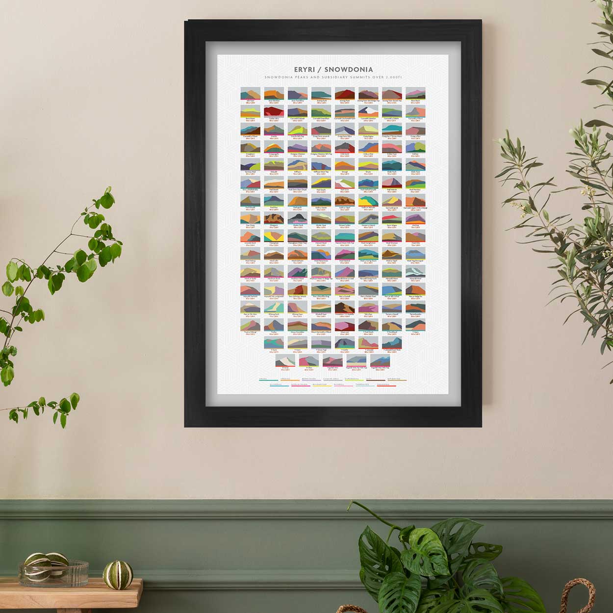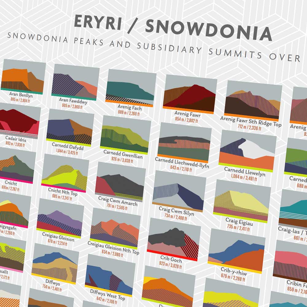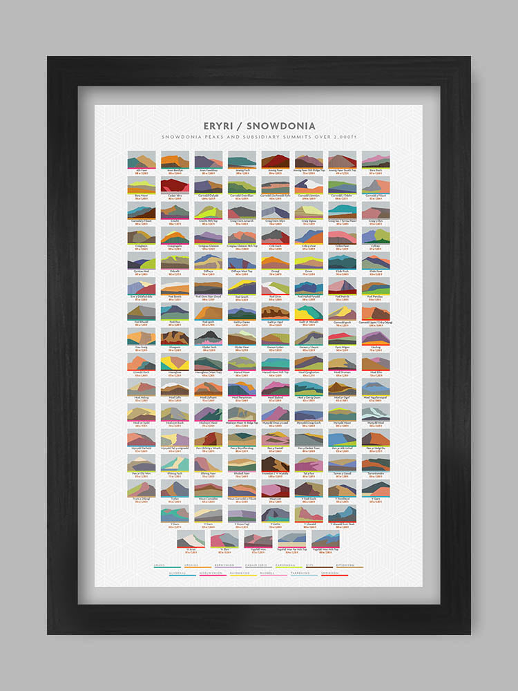 Eryri / Snowdonia Poster Print follows our Wainwrights and Munros designs and shows all the peaks and subsidiary summits over 2,000 ft that make up the stunning and challenging Eryri / Snowdonia region.