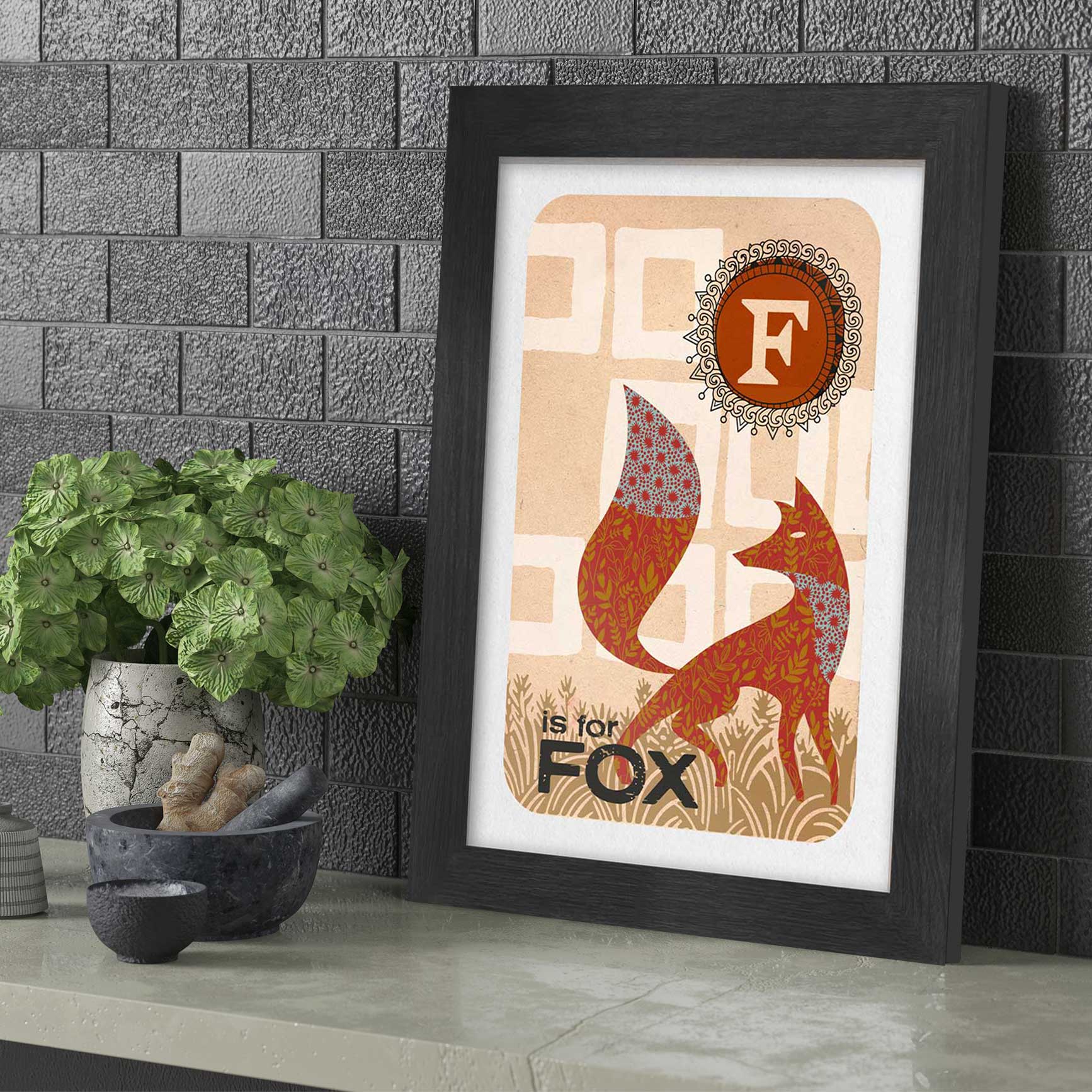 F is for Fox Poster Print is available unframed, or framed in a 4cm black or white wooden frame with a plexiglass cover.