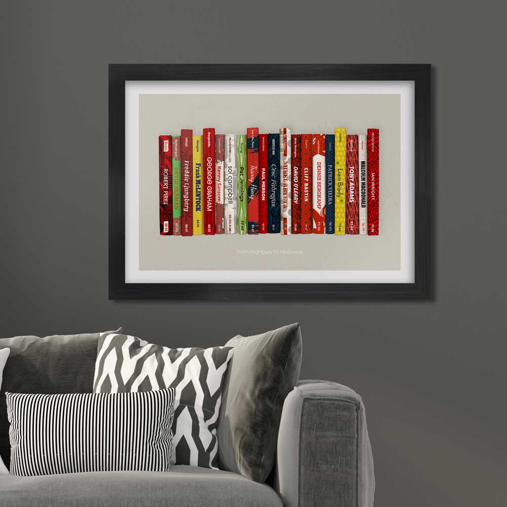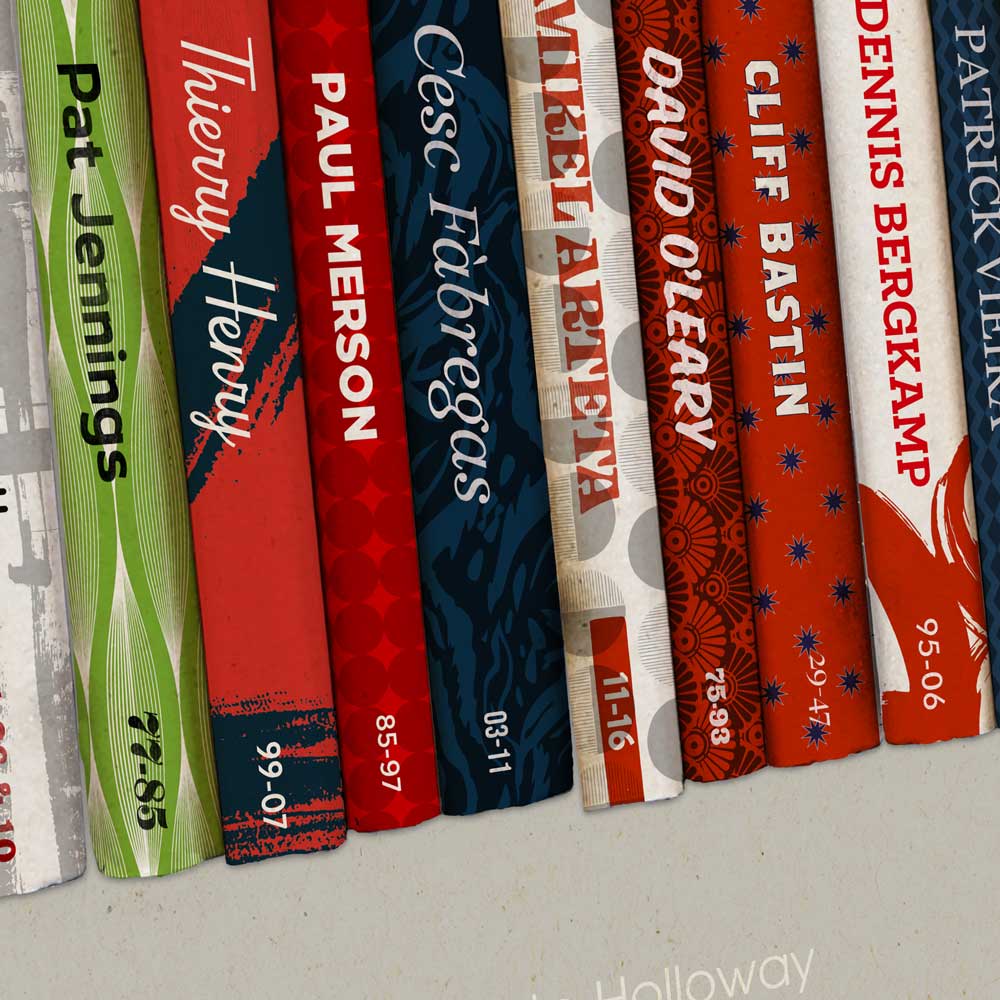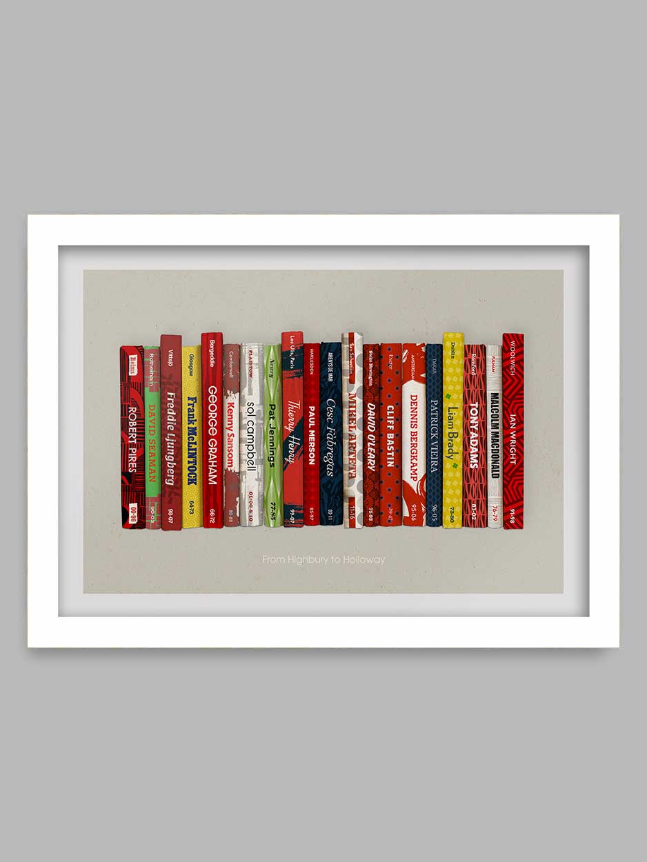 From Highbury to Holloway - Arsenal poster print celebrates some of the great names in the club's history. It features the years they played for the club. Styled on the classic mid-century penguin book designs.