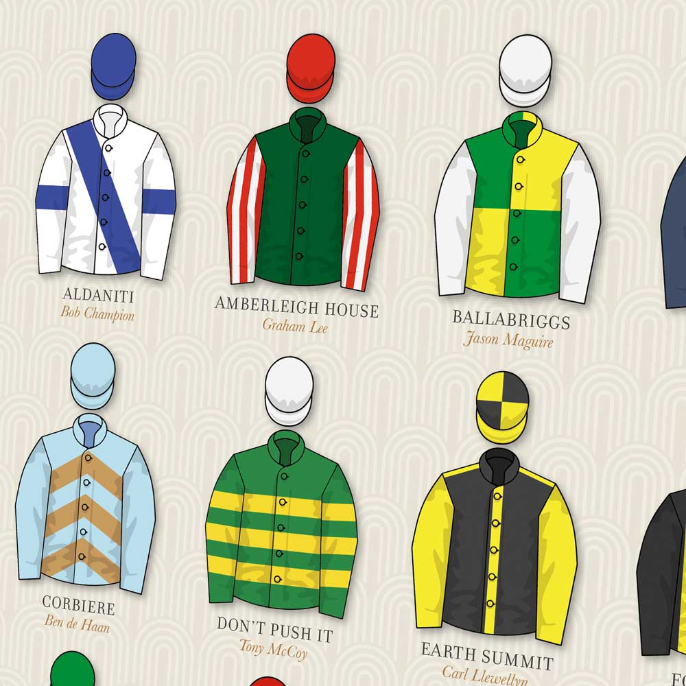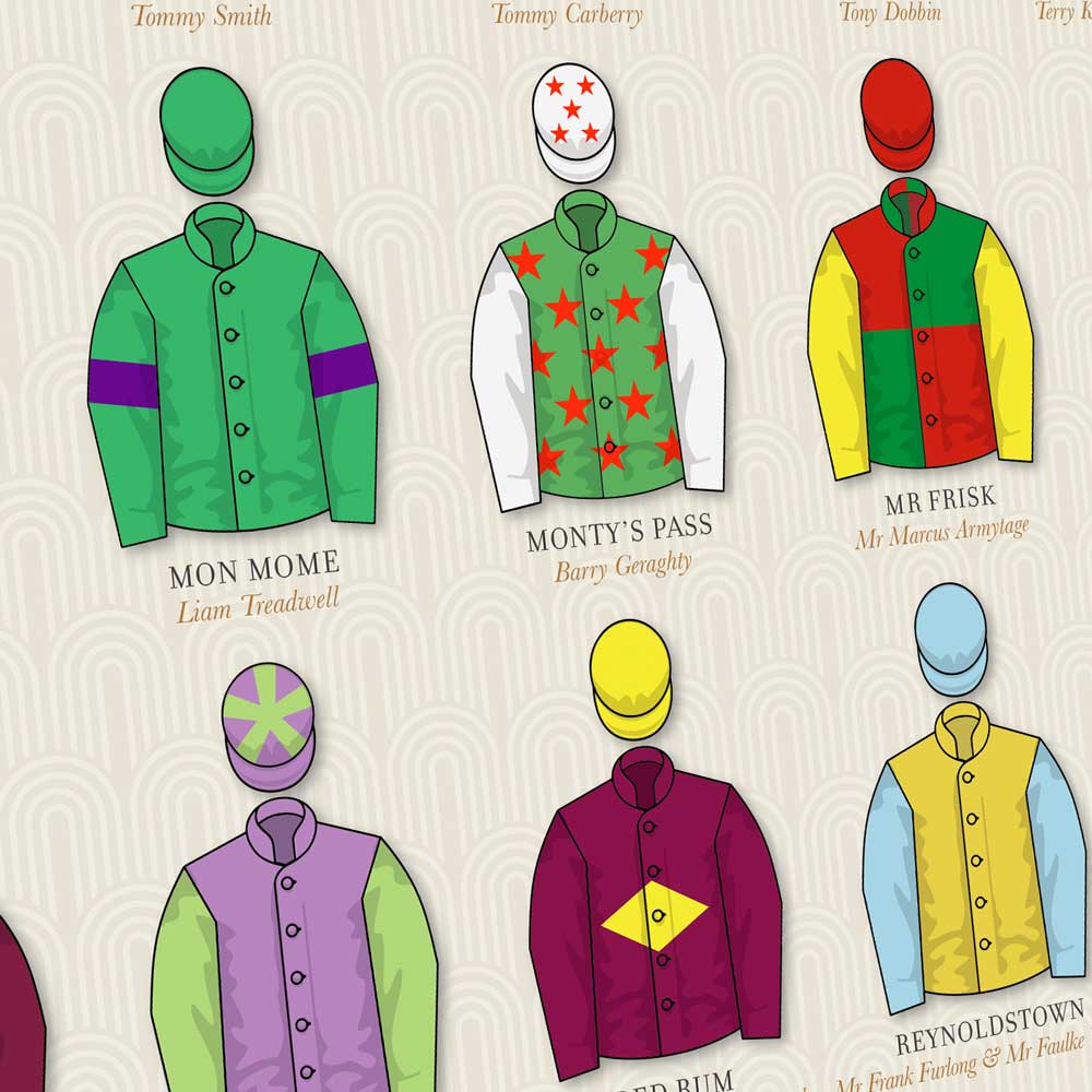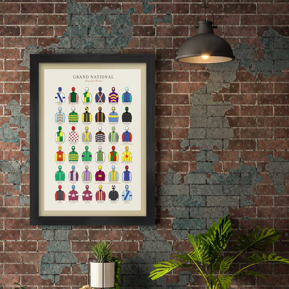 Grand National Memorable Winners - Horse Racing Poster print is available unframed, or framed in a 4cm black or white wooden frame with a plexiglass cover.