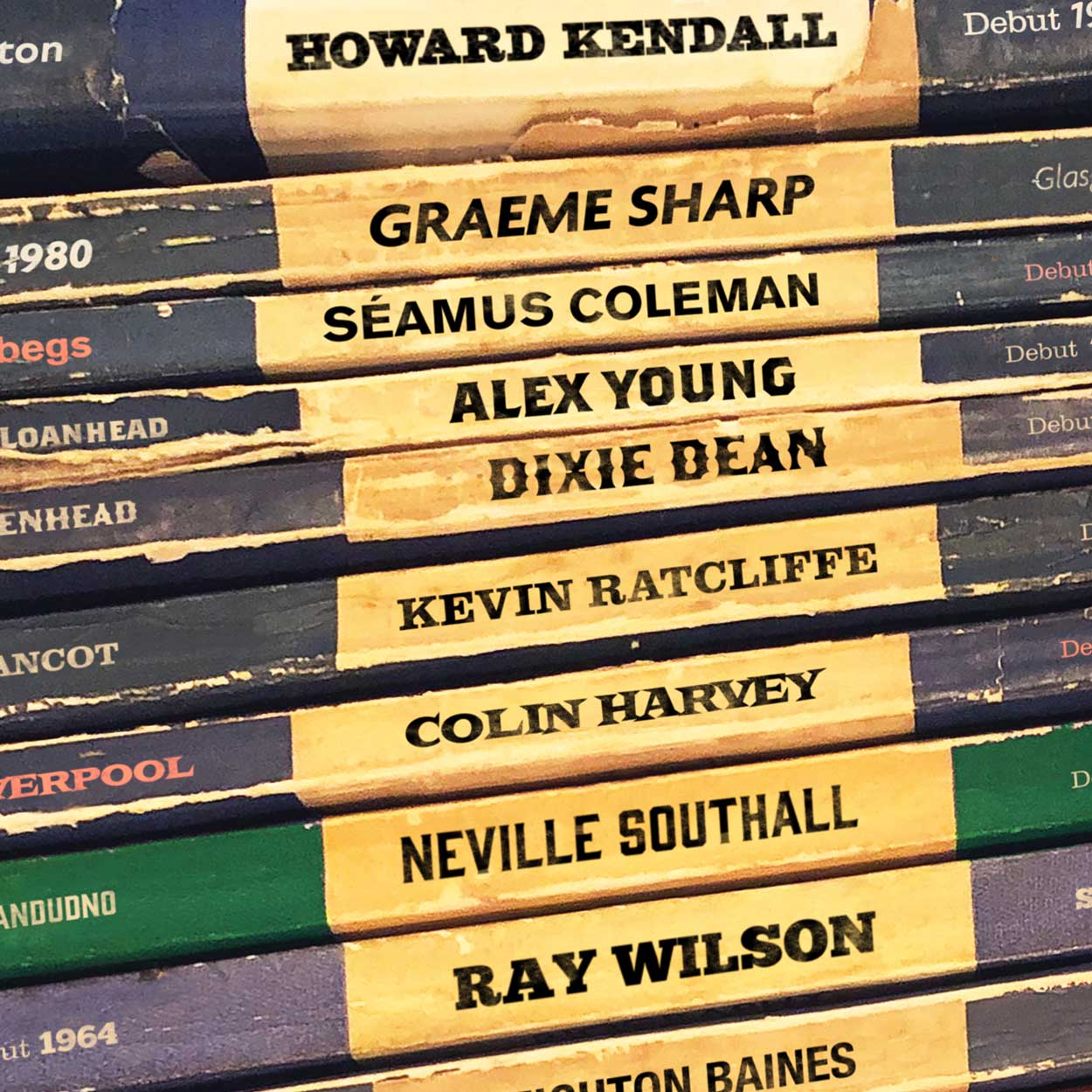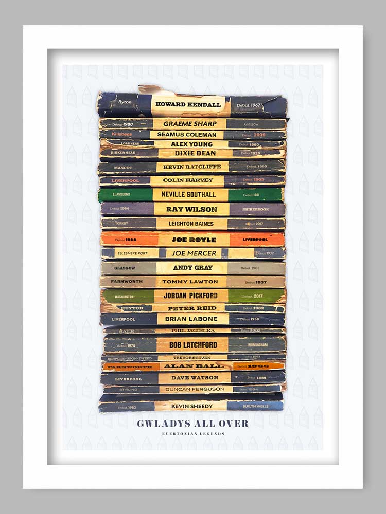 Gwladys All Over - Everton Poster Print celebrates some of the great names in the club's history together with their birthplace and the date of their Toffees debut.