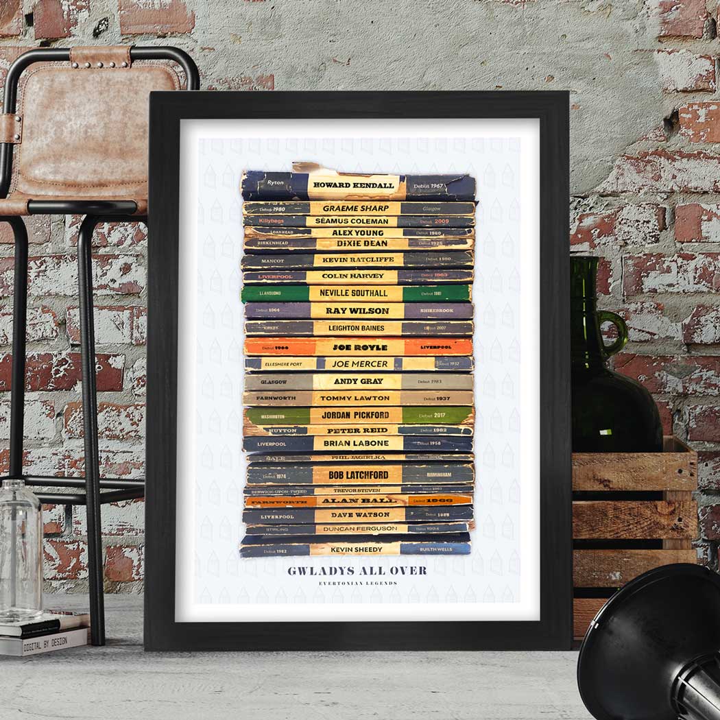 Gwladys All Over - Everton poster print is available unframed, or framed in a 4cm black or white wooden frame with a plexiglass cover.