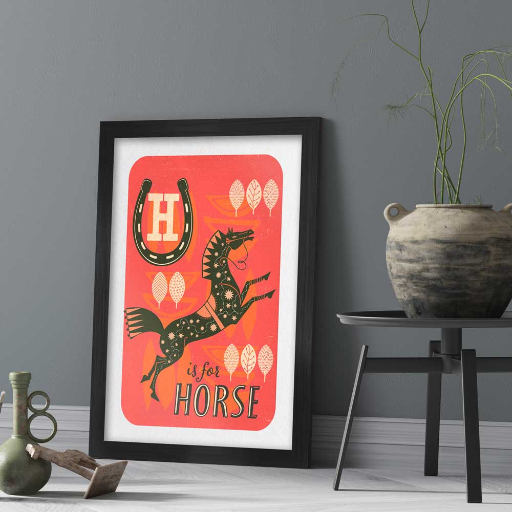 H is for Horse Poster Print is available unframed, or framed in a 4cm black or white wooden frame with a plexiglass cover.