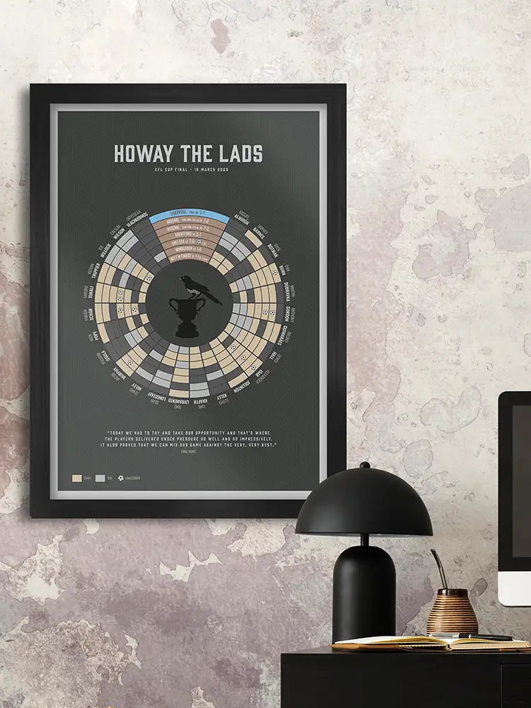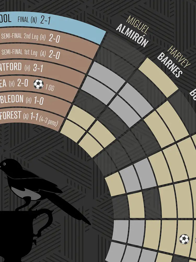 Howay The Lads - Newcastle United poster print is an infographic style record of the Toon's EFL Cup campaign that ended in glory at Wembley. The games, the line-ups and goalscorers.