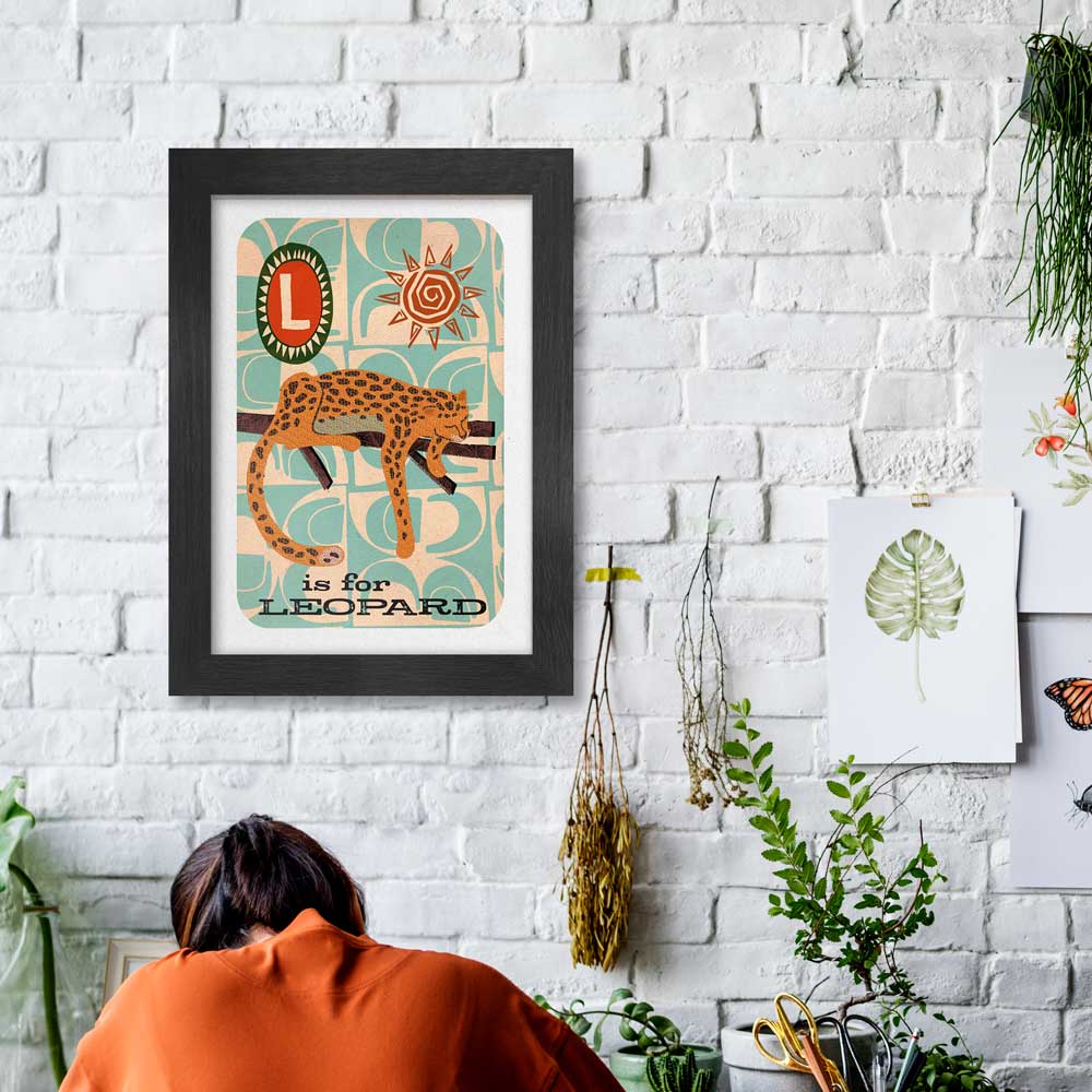 L is for Leopard Poster Print is available unframed, or framed in a 4cm black or white wooden frame with a plexiglass cover.