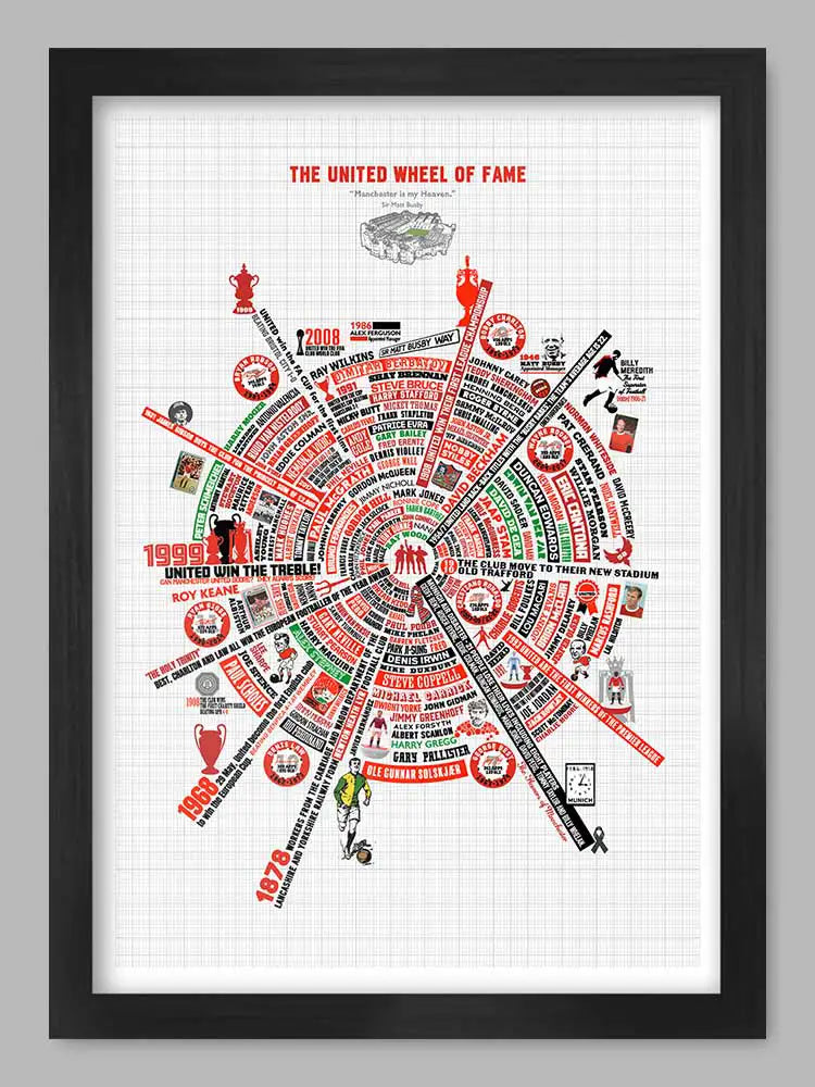 Manchester United Wheel of Fame is a graphic styled chronicle of the club that started life as Newton Heath LYR. It includes many firsts and snippets of their history together with many of their best known players.