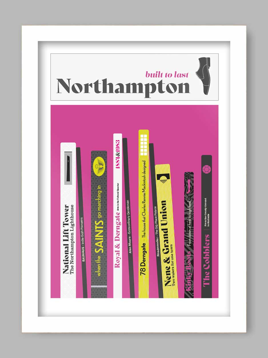 Northampton - Built to Last Poster Print. A graphic design showing some of Northampton's classic locations, sports teams and personalities.