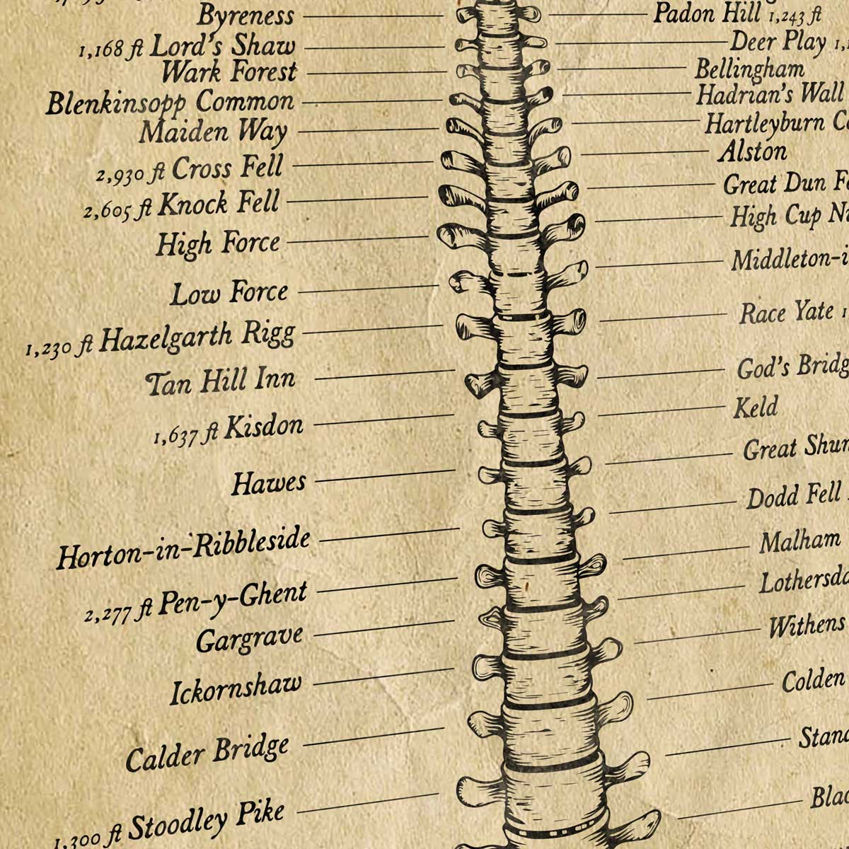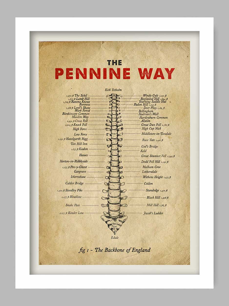 Pennine Way Poster Print. Commonly known as the 'Backbone of England' this poster charts the route from Edale to Kirk Yetholm. 268 miles in total.