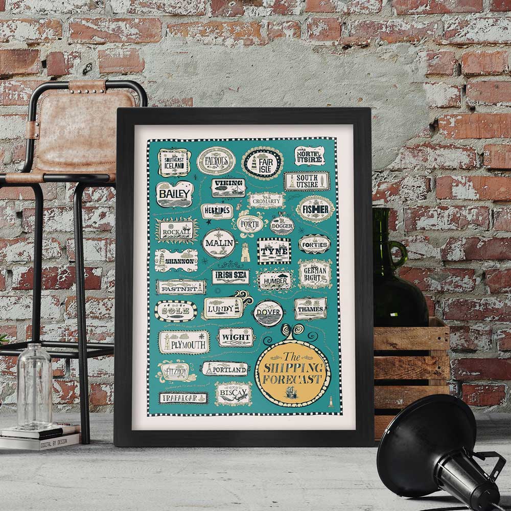 Our Shipping Forecast Sea Blue Poster Print is perfect for fans of shipping, coastal or the eponymous Radio transmission of 'The Shipping Forecast'. Each area is covered from the most northerly South east Iceland to Trafalgar in the south. The poster contains some classic quotes such as; "Dover, Wight, Portland 4 or 5, increasing 6 soon, rain or slight drizzle, good".