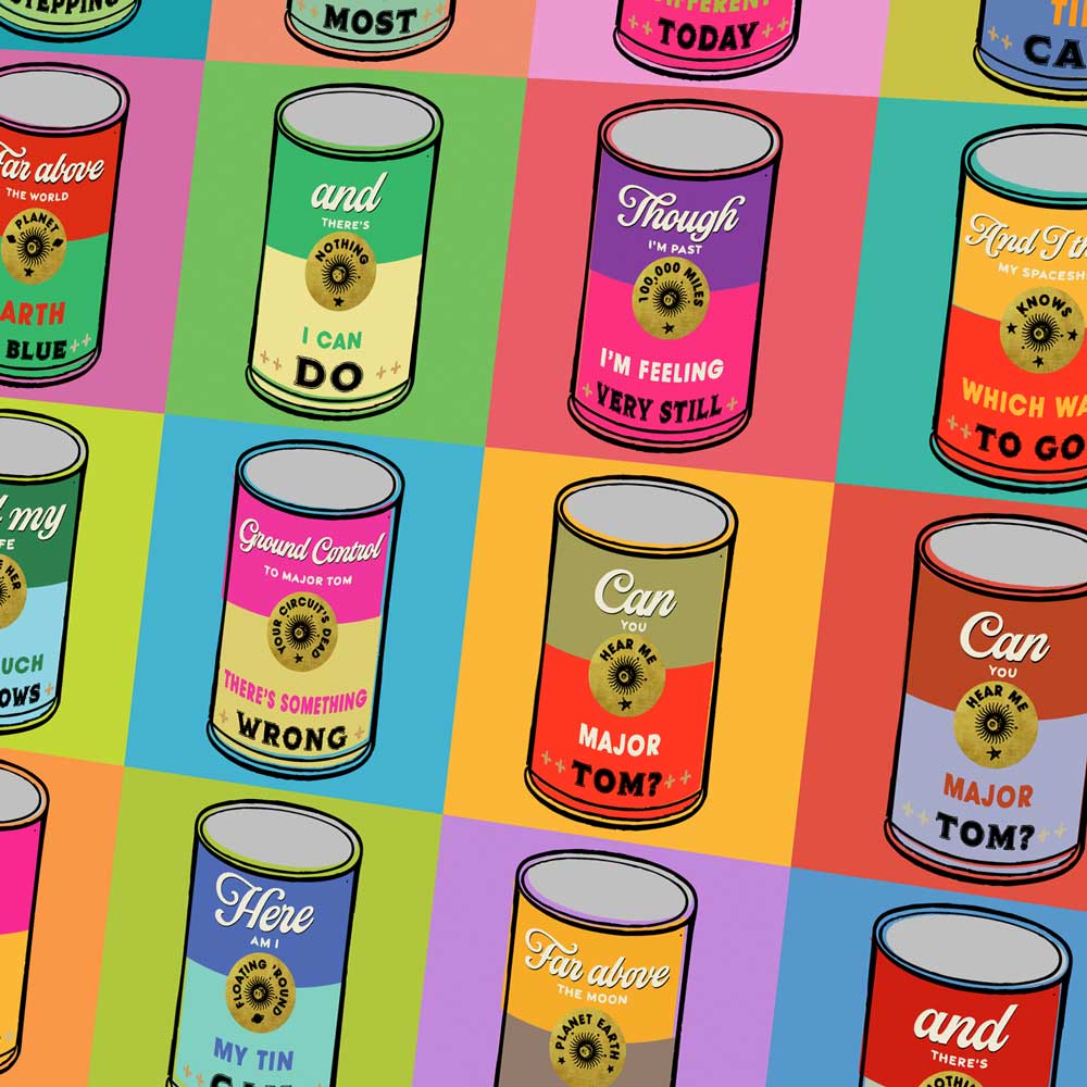 Sitting in a Tin Can - Music Poster Print. Styled in homage to Andy Warhol's famous Campbell's Soup print, this poster features the lyrics to Bowie's Space Oddity in 24 separate elements.
