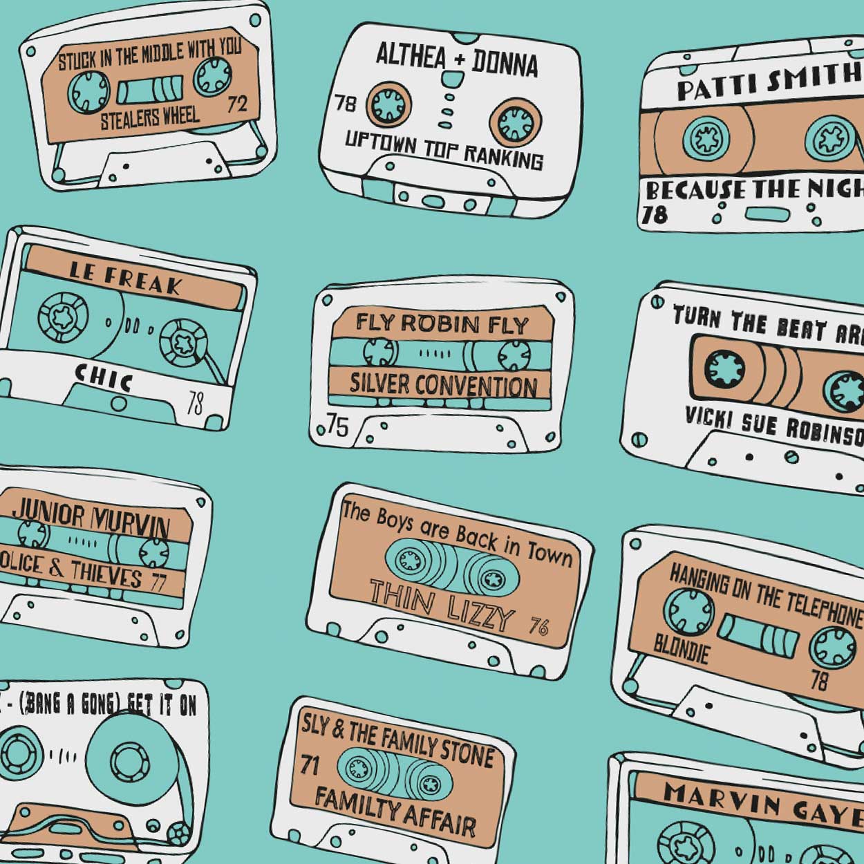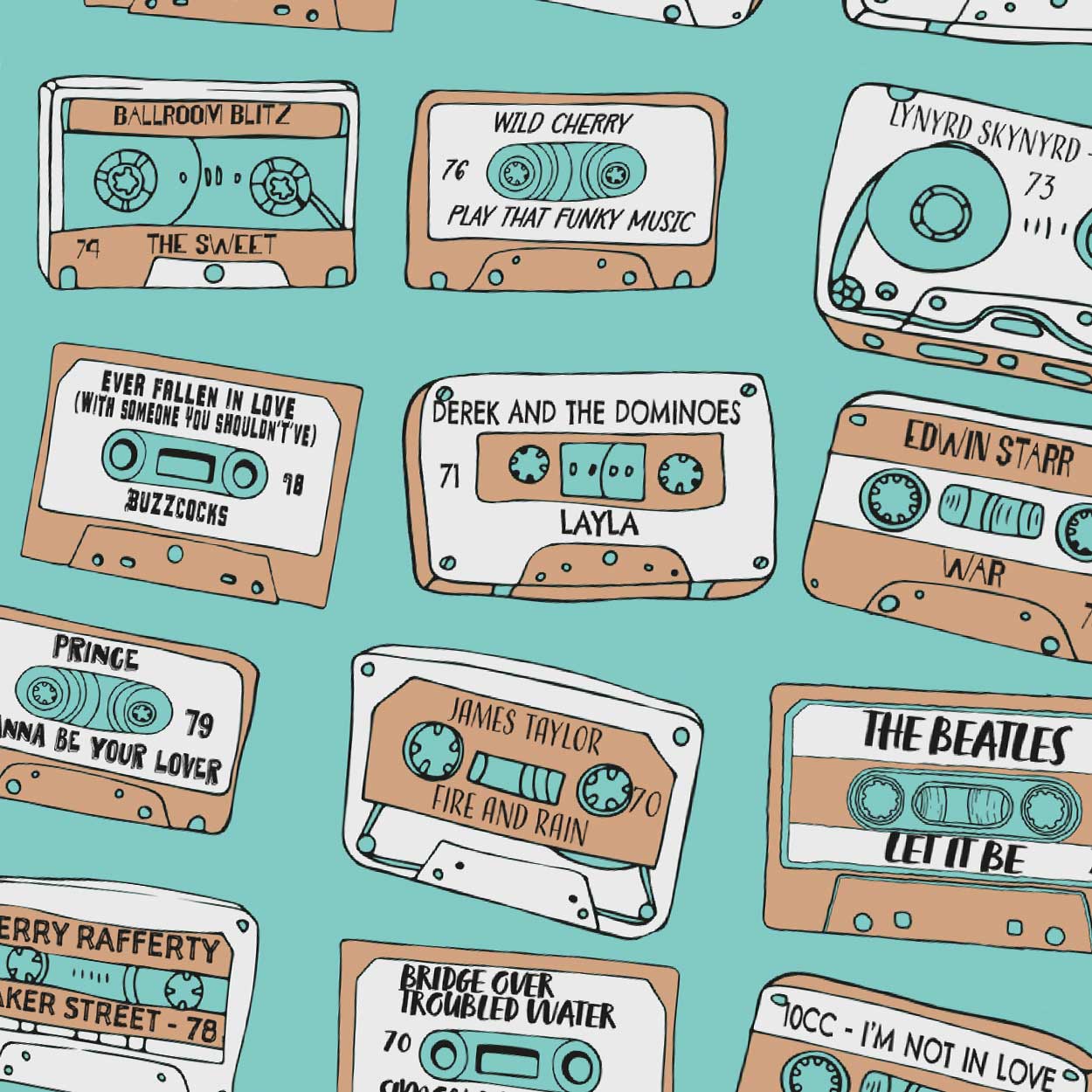 Super Sounds of the 70s - Music Poster Print. A great era for music with some timeless classics and a nod to Steven Wright's K.Billy featured in Reservoir Dogs.