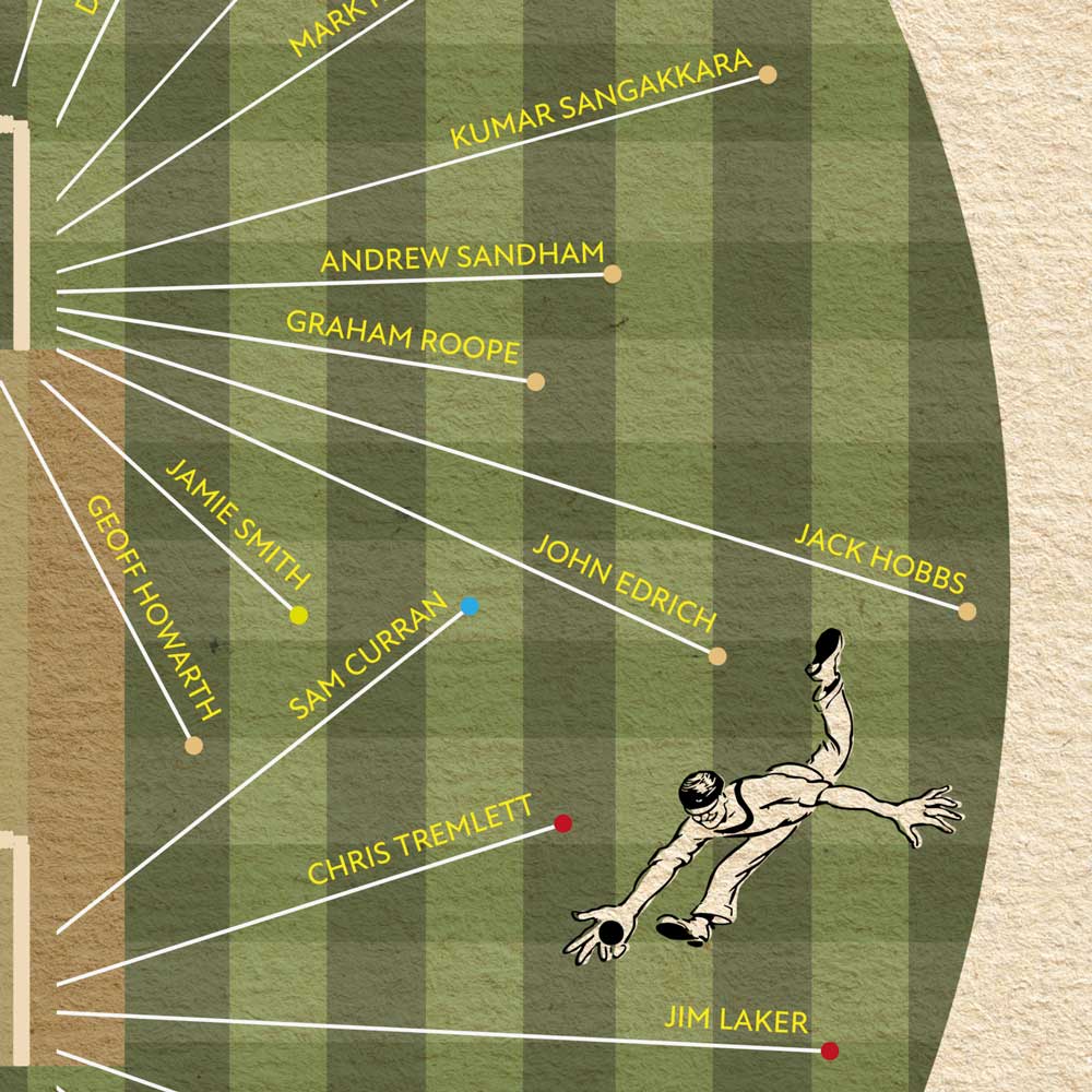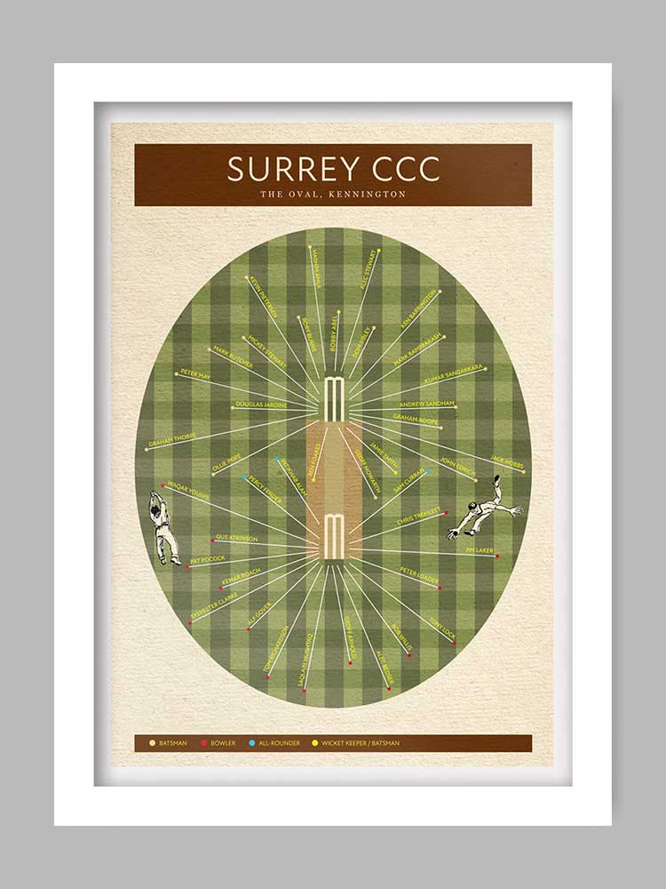 Surrey CCC - Cricket Poster Print. A celebration of notable cricketers who have represented the county with the famous chocolate coloured caps.