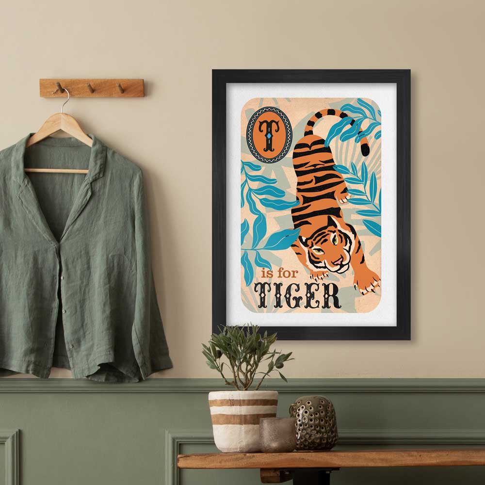 T is for Tiger Poster Print is available unframed, or framed in a 4cm black or white wooden frame with a plexiglass cover.