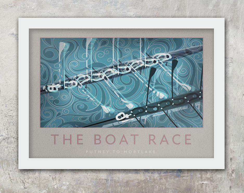 This retro style poster depicting one of the nation's favourite sporting events - The Oxford & Cambridge Boat Race, would make a great addition to any room. It's beautiful shades of blue and subtle background pattern detail make this a really stylish piece of artwork.