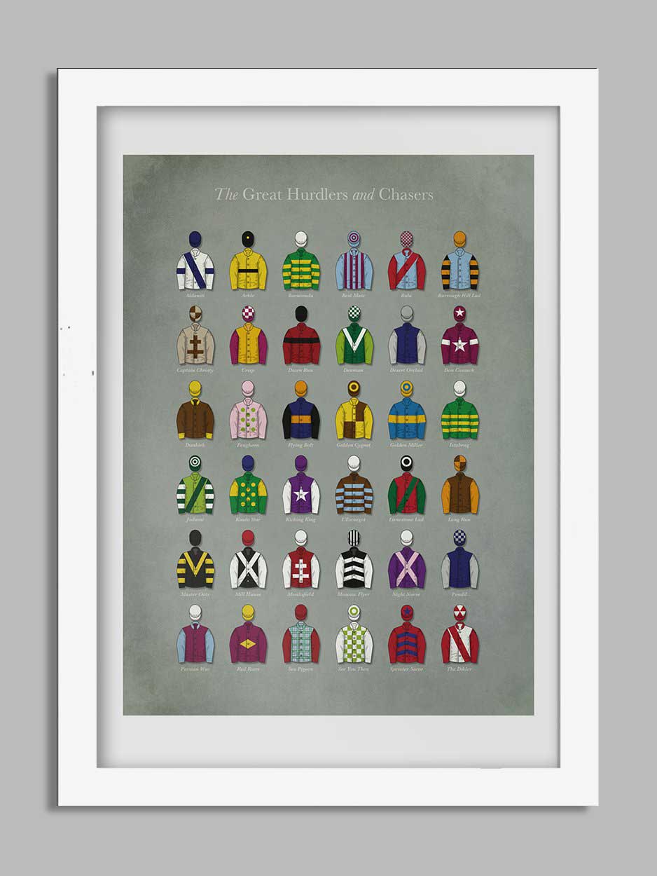 Poster displaying the owner racing silks of some the great hurdlers and chasers in British and Irish Horse Racing. Including:- Red Rum, Kauto Star, Desert Orchid and Golden Miller.