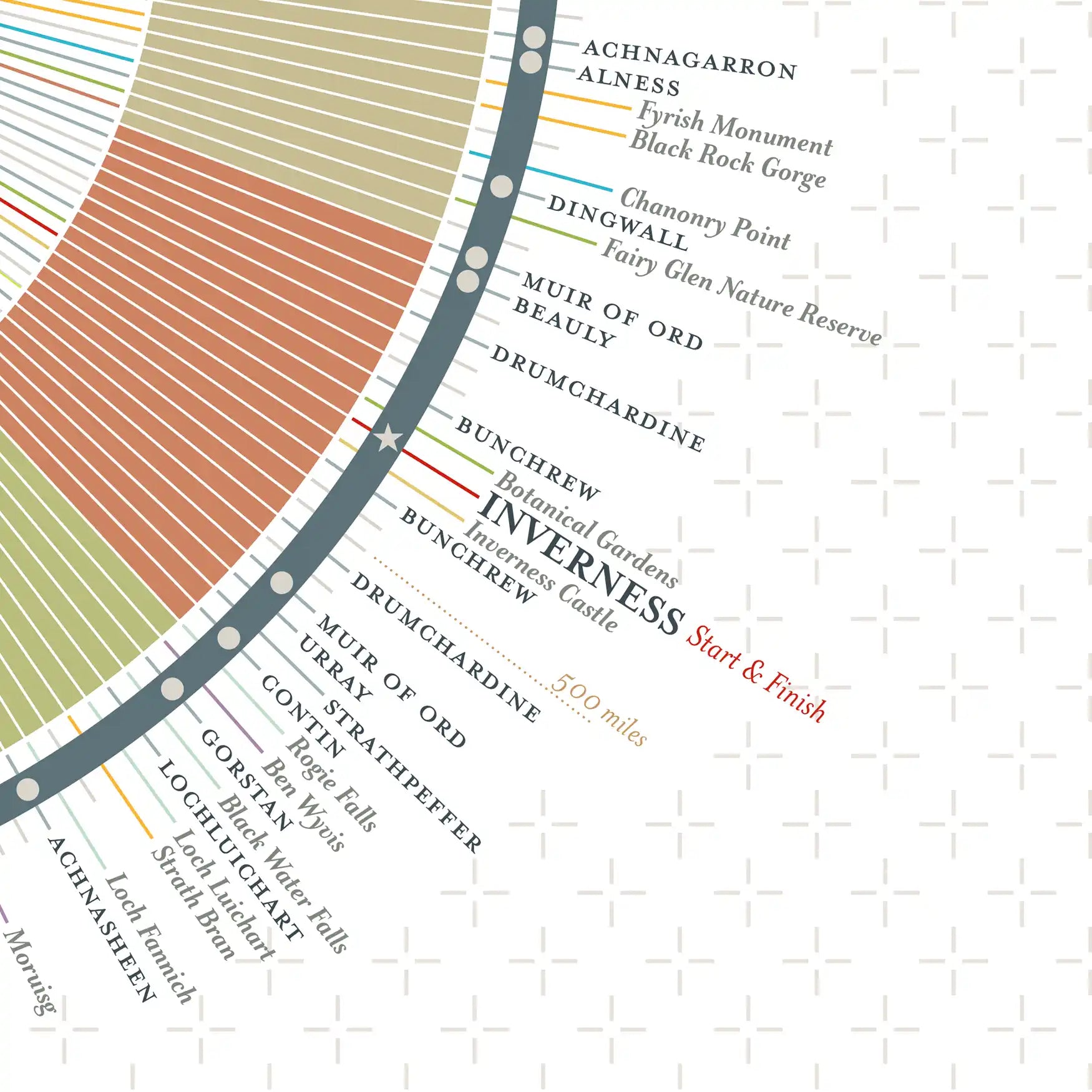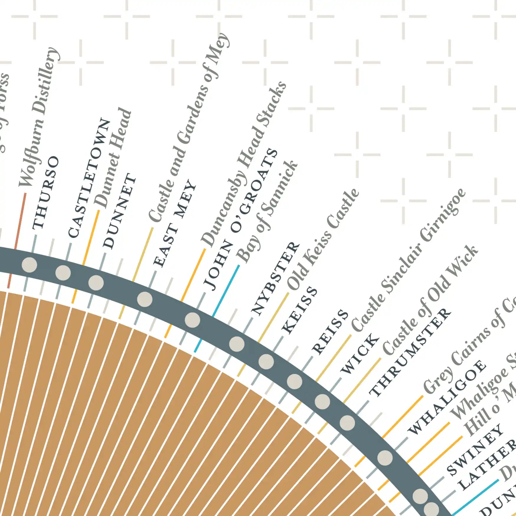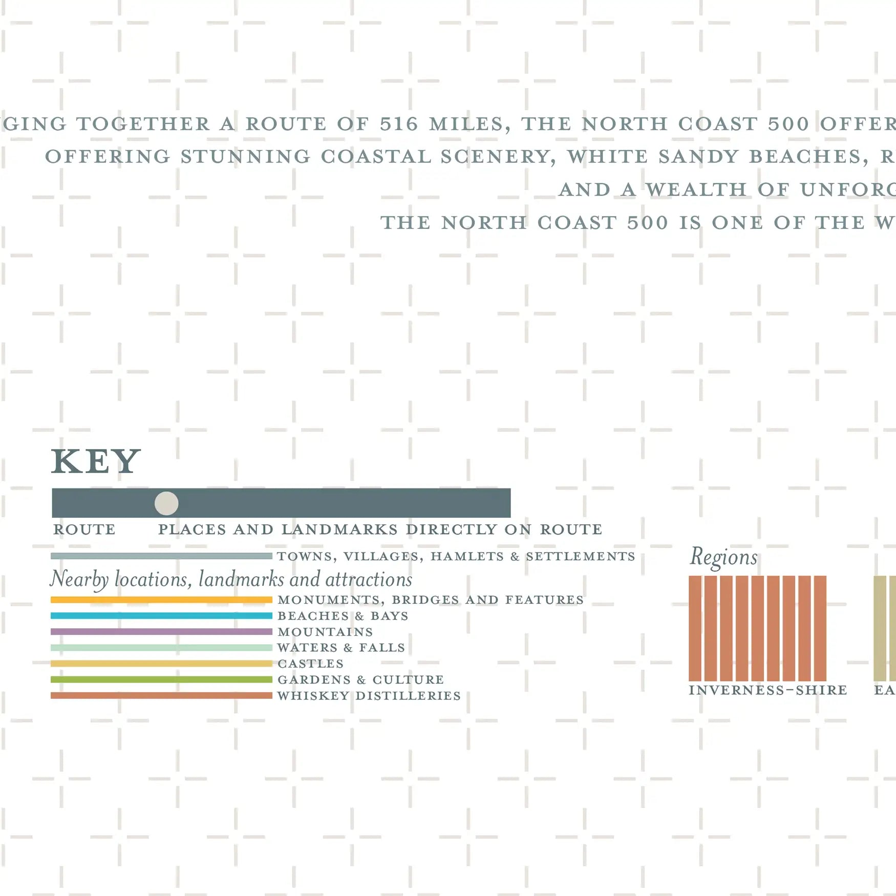 Bringing together a route of 516 miles, The North Coast 500 offers a unique circular road route around the North of Scotland. The route offers stunning coastal scenery, white sandy beaches, rugged mountain and a wealth of unforgettable experiences. Our North Coast 500 poster print design celebrates this fantastic journey detaling places and landmarks along the route.