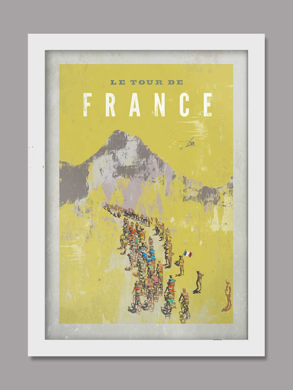 Fresh from the studio, a beautiful design featuring the riders and fans of The Tour de France. This poster print brings to life the mountain stages of this iconic race. The race that brought us Alpe d'hues, Galibier and Tourmalet.